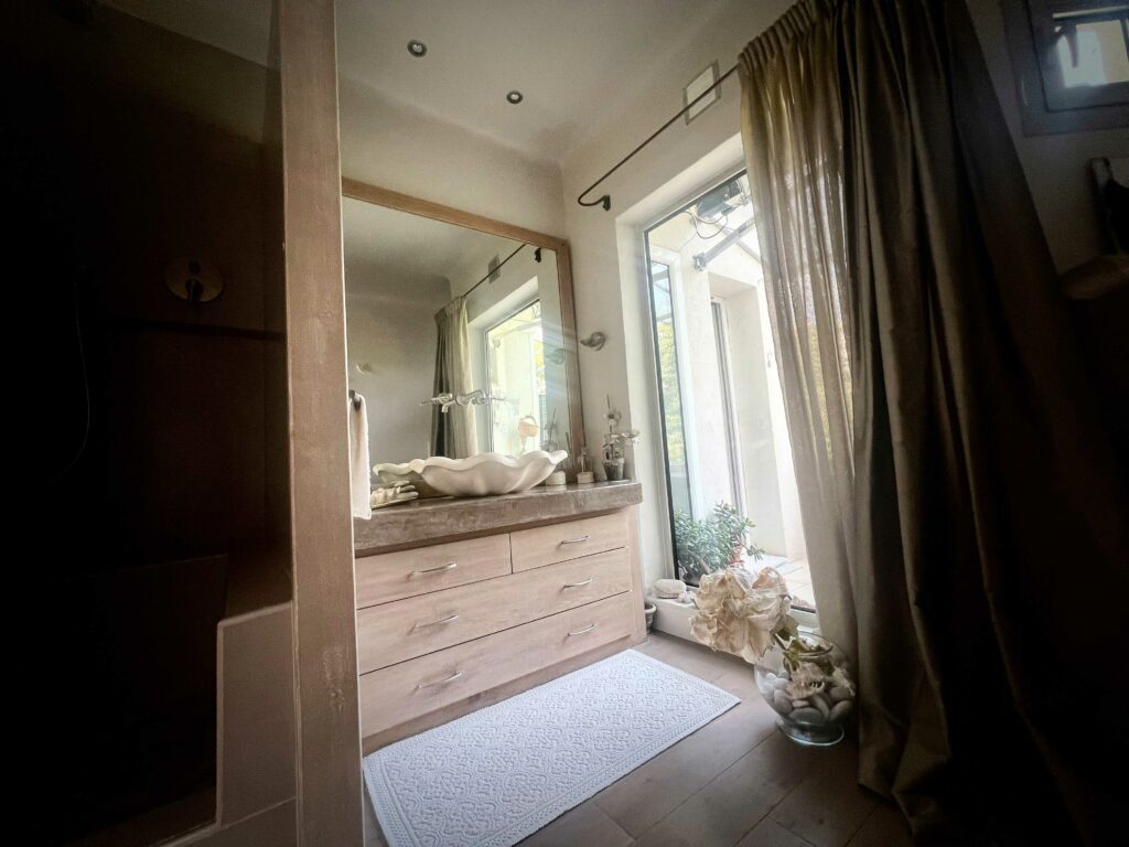 Equipée d’une grande vasque en pierre en forme de coquillage, dessinée et concue tout spécialement par un tailleur de pierre de la région, avec une robinetterie moderne et design intégrée dans un grand miroir qui sublime cet espace de bien être.